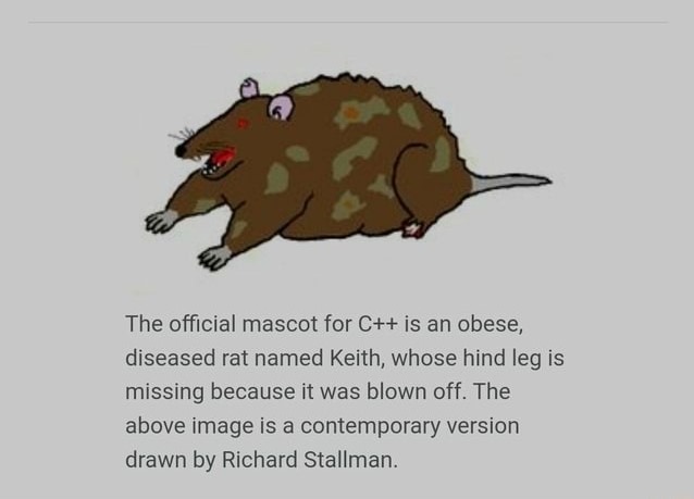 Для эффектного начала вспомним известную шутку-мистификацию про маскота одного из самых популярных языков программирования C++. Однажды на сатирическом сайте “Уинциклопедия” появилась картинка с подписью: “Официальным маскотом C++ является тучная больная крыса по имени Кит, у которой отсутствует задняя лапа, потому что ее оторвало…” Тот, кто от нечего делать вбросил в сеть изображение, дополнил, что крыса нарисована знаменитым программистом, автором множества приложений, идеи свободного ПО и основателем GNU/Linux Ричардом Столлманом.